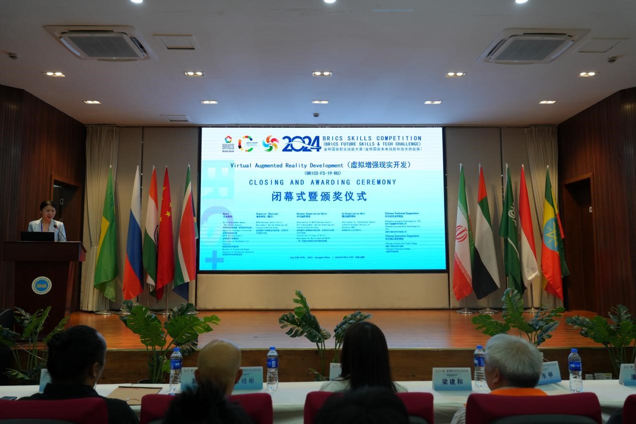 7月27日,2024金砖国家职业技能大赛(金砖国家未来技能和技术挑战赛)虚拟增强现实开发赛项全国选拔赛暨国内决赛在成都市技师学院(成都工贸职业技术学院)闭幕。金砖国家工商理事会技能发展、应用技术与创新中方工作组执行总监崔雪艳,...